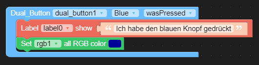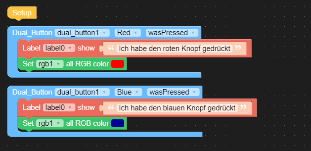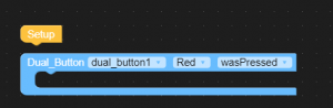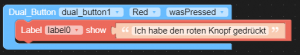 Zunächst wird der Dual-Button Block gebraucht Bei diesemBlock muss ausgewählt werden, welchen der beiden Knöpfe (blau oder rot) implementiert werden soll. Hier muss zunächst der red ausgewählt werden