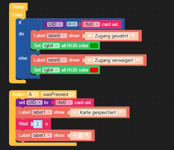 Wird der Button gedrückt, soll die Variable UID den Wert der Kartennummer bekommen, also die Kartennummer in der Variable gespeichert werden.